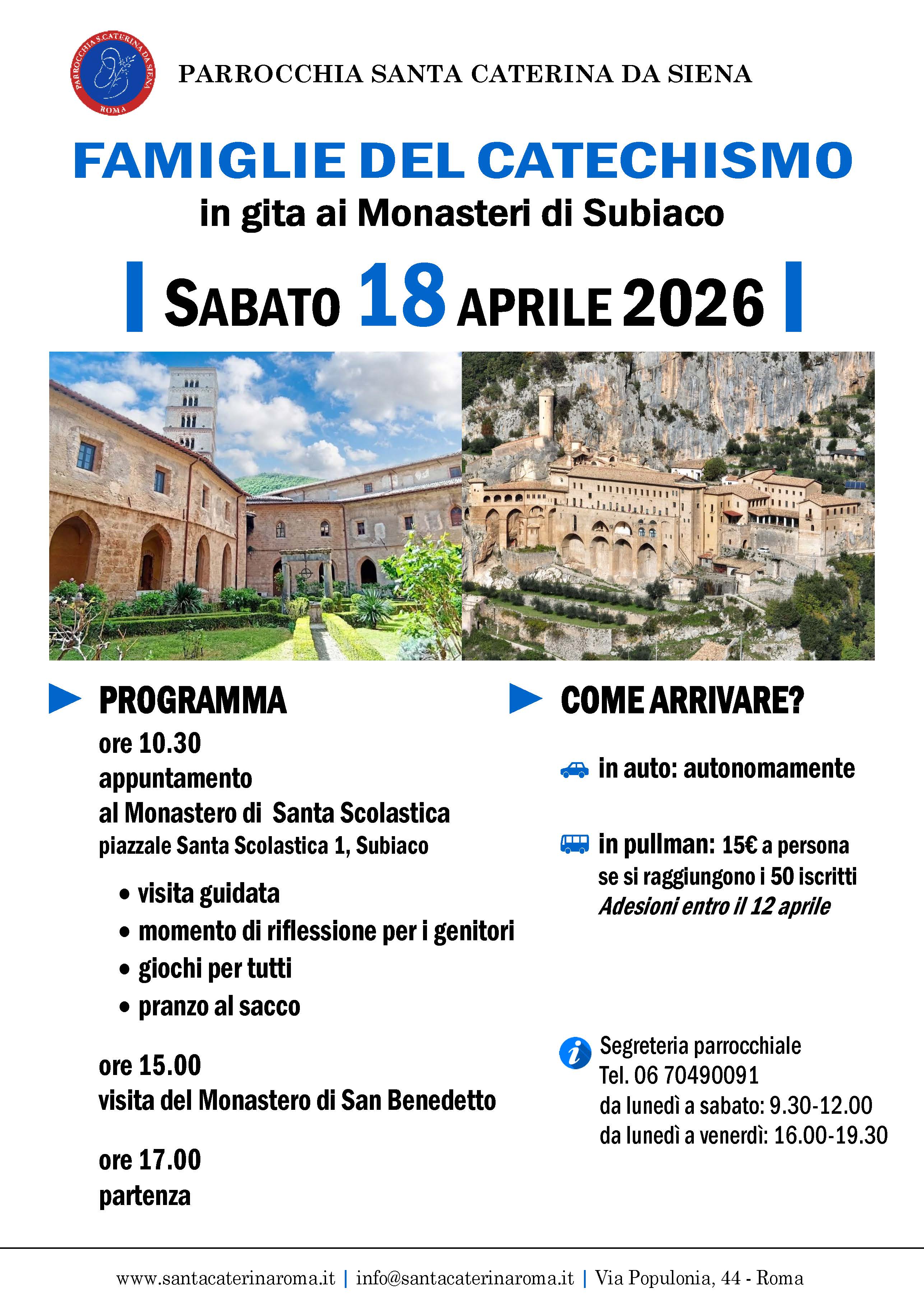 Sabato 18 aprile Famiglie del catechismo - in gita ai Monasteri di Subiaco Locandina | |